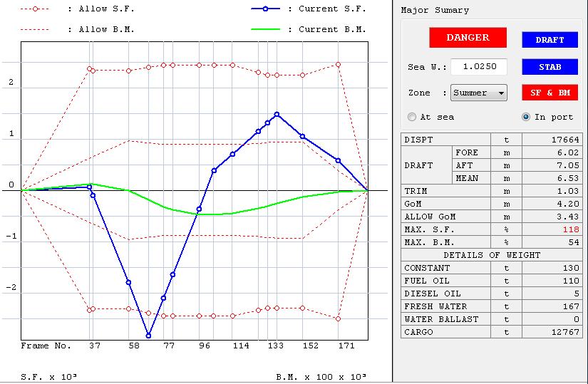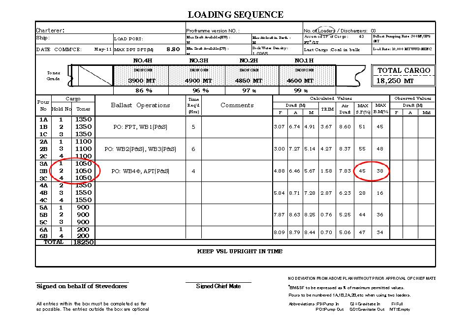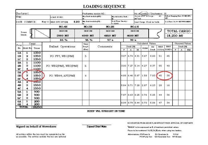 Hình minh họa bên trên chỉ ra các giai đoạn xếp dỡ với phương tiện xếp dỡ là 3 cẩu bờ làm việc đồng thời. Tại một thời điểm, sẽ có 3 trong 4 hầm hàng của tàu được xếp dỡ. Các vòng tròn đỏ nêu bật các dữ liệu quan trọng của một stage cụ thể. Đây là stage số 3, các hầm được xếp hàng là hầm 1, hầm 2, hầm 4. Nói chung, năng lực của các phương tiện xếp dỡ là đồng đều. Vì vậy, số lượng hàng ấn định cho mỗi hầm trong một stage phải như nhau. Vòng tròn đỏ bên phải là số liệu lực cắt và mô-men uốn (Shearing Force and Bending Moment) được tính toán, chúng phải nhỏ thua 100%.