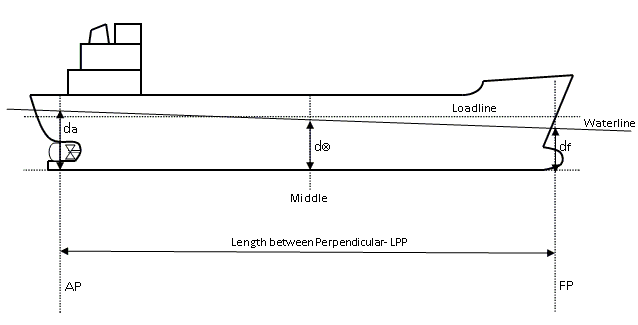 8. Mớn nước trung bình- dm: là giá trị trung bình của mớn nước mũi và mớn nước lái, dm= (df+da)/2.  Theo lý thuyết dm= d¤, nhưng thực tế tàu luôn luôn bị võng hoặc ưỡn (cong dọc) nên nói chung dm ≠ d¤.