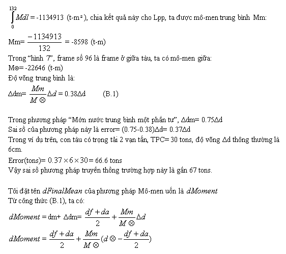 • Bản chất của tích phân xác định là diện tích. Công thức hình thang là một phương pháp tính gần đúng tích phân xác định, với tàu biển các hình thang con được hình thành từ các frame và moment được tính toán theo frame. Trong hàng hải phương pháp cũng hay được sử dụng là công thức simpson. Đó chỉ là những phương pháp gần đúng, nhưng tính theo frame còn mịn hơn mớn nước chỉ tại 3 điểm mũi, lái và giữa tàu. Nếu yêu cầu độ chính xác cao như tính toán tài chính thì ngay cả phương pháp nội suy đa thức kiểu Ayken cũng sai đáng kể, nhưng điều đó không cần thiết trong hàng hải. Chúng ta có thể tính toán gần như tuyệt đối sử dụng mạng nơron dành cho nội suy (và cả ngoại suy), nhưng tôi chưa thấy ai có nhu cầu về việc này.