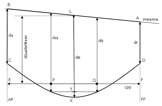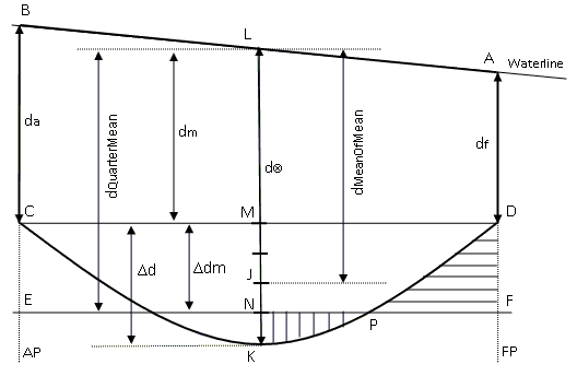Trong “Hình 2”, với dQuarterMean được dùng làm mớn nước tương đương, để giả định là tàu không bị cong dọc. Như vậy, đáy tàu giả định là đường thẳng EF đi qua điểm N, ta có hình thang ABEF là tương đương. Xét một nửa tàu đối xứng phía mũi, ta dễ thấy biện pháp giả định tương đương này chỉ có thể chấp nhận được khi diện tích hình NKP bằng với diện tích hình DPF.