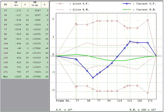 Hiện nay các tàu biển trên thế giới (trừ Việt nam và một số nước kém phát triển) đều được trang bị phần mềm tính mô-men uốn và lực cắt. Đường cong xanh lá cây trong “hình 4” biểu thị mô-men uốn theo trục dọc thân tàu l từ đường vuông góc lái tới đường vuông góc mũi. Bảng bên trái đồ thị chứa số liệu mô-men uốn đã được tính toán tại các frame trọng yếu đánh số từ 0 bắt đầu từ đường vuông góc lái. Các frame kề nhau kết hợp với trục hoành và đường cong mô-men tạo thành các hình thang con. Bằng phương pháp tổ hợp hình thang, ta dễ dàng tính được tích phân xác định của mô-men M trên chiều dài Lpp. Trong ví dụ này, Lpp= 132 (m), tôi tính được kết quả tích phân là: