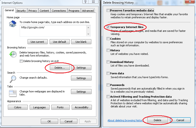 Trong cửa sổ thứ nhất, nhấn Delete; chọn hộp kiểm Temporary Internet Files ở cửa sổ thứ hai, rồi nhấn Delete, về cửa sổ thứ nhất nhấn OK.