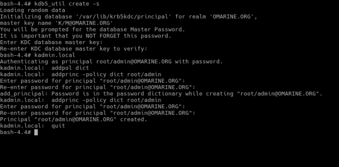 Sau đó chạy kadmin.local để thêm chính sách mật khẩu tên là dict, đây là chính sách sử dụng từ điển để kiểm tra mật khẩu yếu. Chính sách này được áp dụng ngay để tạo quản trị krb5 tên là root/admin. Hai lệnh đó trong dấu nhắc của kadmin.local như sau:
