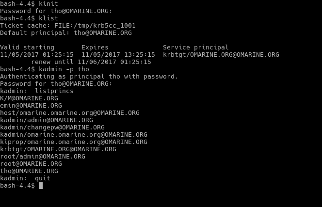 Sau cùng, chúng ta tạo thêm principal host/omarine.omarine.org dùng cho dịch vụ host, rồi thêm nó vào bảng khóa /etc/krb5.keytab: