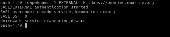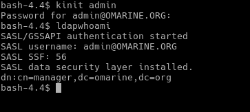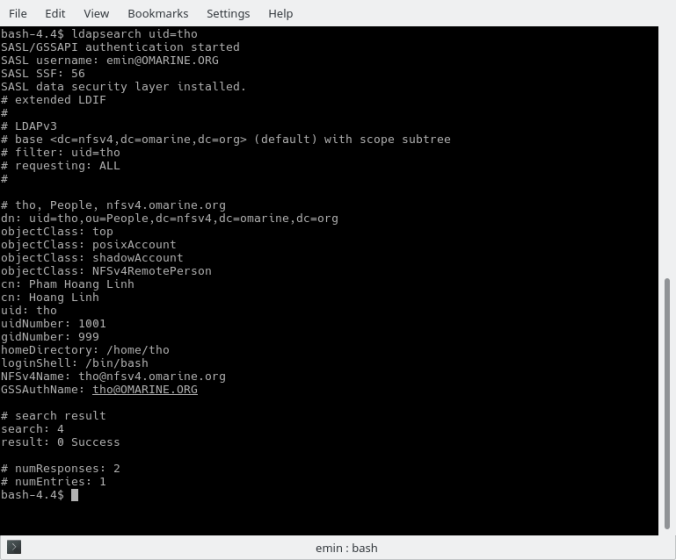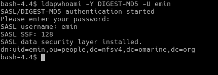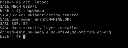 Các lệnh truy cập ldap phải chỉ ra kỹ thuật truy cập, nhưng vì chúng ta đã cấu hình trong tệp .ldaprc như biểu thị trong hình trên nên GSSAPI được sử dụng làm kỹ thuật mặc định. Lệnh cho biết chúng ta đang ở dn: uid=emin,ou=people,dc=nfsv4,dc=omarine,dc=org.