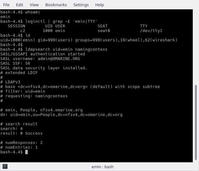 Trong hình dưới đây, emin là người sử dụng hiện hành, sử dụng console tty2, có số id là 1000, thuộc các nhóm users, wheel và wireshark. Lệnh ldapsearch tìm thấy emin có dn là uid=emin,ou=People,dc=nfsv4,dc=omarine,dc=org.