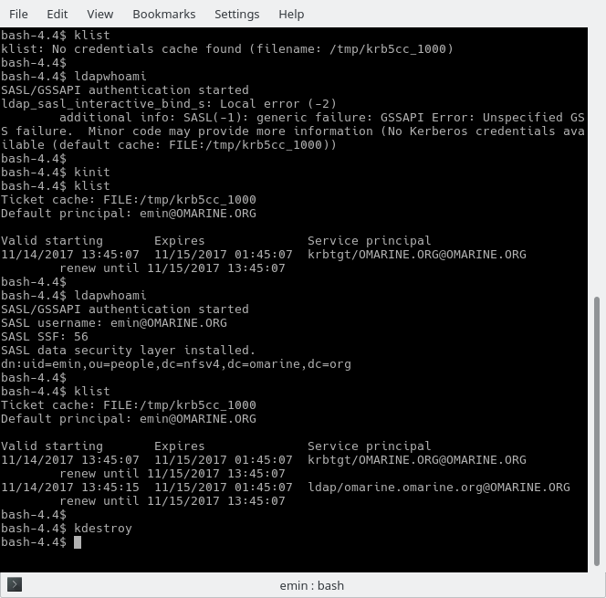 Ban đầu lệnh klist thông báo emin không có vé nào. Vì vậy emin không thể truy cập ldap và lệnh ldapwhoami thất bại. Vì emin được xác thực trước nên lấy vé TGT bằng kinit không cần vào mật khẩu. Sau kinit, lệnh klist trình bày TGT của emin. Từ đó lệnh ldapwhoami hoạt động. Khi sử dụng ldapwhoami emin đã trup cập ldap nên klist tiếp theo hiển thị thêm vé dịch vụ ldap/omarine.omarine.org. Sau cùng, emin hủy vé bằng lệnh kdestroy.