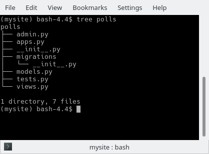 Chương trình Polls là một gói độc lập mà dự án mysite của bạn sẽ sử dụng, nó có thể được đóng gói và cài đặt để dùng cho các dự án khác. Hiện tại, chúng ta sẽ đặt thư mục chương trình bên cạnh tệp manage.py để nó có thể được nhập khẩu như một module mức đỉnh chứ không phải module con của mysite. Bạn chuyển đến thư mục mysite (bên ngoài) và tạo chương trình: