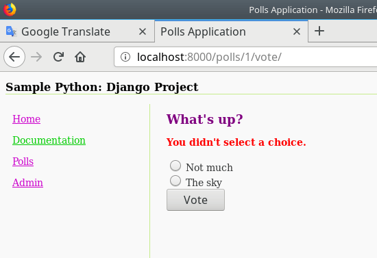 Hàm vote() xử lý hành động biểu quyết của khách trên trình duyệt. request.POST là một đối tượng kiểu từ điển mà giữ dữ liệu submit. request.POST['choice'] trả về id của mục bình chọn được biểu quyết. Nếu mục bình chọn không được cung cấp trong dữ liệu POST, lỗi KeyError được phát sinh và xử lý quay trở lại form biểu quyết với một ngữ cảnh thông báo. Nếu không, số biểu quyết của mục bình chọn tăng 1, kết quả được giữ vào cơ sở dữ liệu rồi trả về một HttpResponseRedirect chuyển hướng tới trang kết quả. Hàm HttpResponseRedirect nhận 1 đối số, là URL mà được chuyển hướng tới. Hàm reverse() đổi ngược từ tên mẫu URL sang URL. Trong trường hợp này, sử dụng bổ sung thêm đối số từ khóa args được gán bởi một đối tượng lặp được bao gồm các giá trị xem như “bắt được” từ route (xem hàm path() bên trên), cụ thể là chỉ có một giá trị question.id để hoàn thành URL cho view mục tiêu.