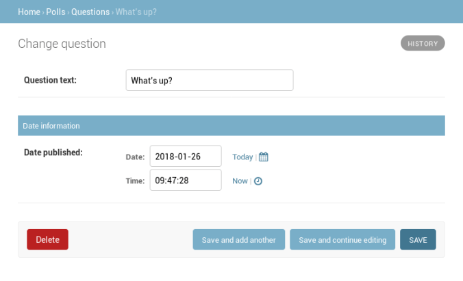 Nhấn chuột vào “Today” và “Now” (nếu thời gian không khớp thời gian hiện tại, bạn kiểm tra lại TIME_ZONE và đặt lại cho đúng rồi tải lại trang). Nhấn tiếp “Save and continue editing”, rồi nhấn “HISTORY” ở góc trên bên phải. Bạn sẽ thấy trang nhật ký ghi lại những thay đổi được thực hiện