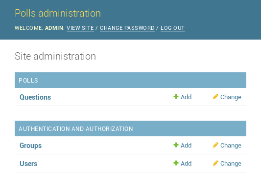 Bây giờ chương trình Polls với mục Câu hỏi đã xuất hiện trên trang đầu admin