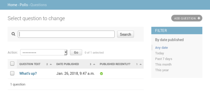 Một sidebar “Filter”để lọc danh sách theo trường pub_date sẽ xuất hiện