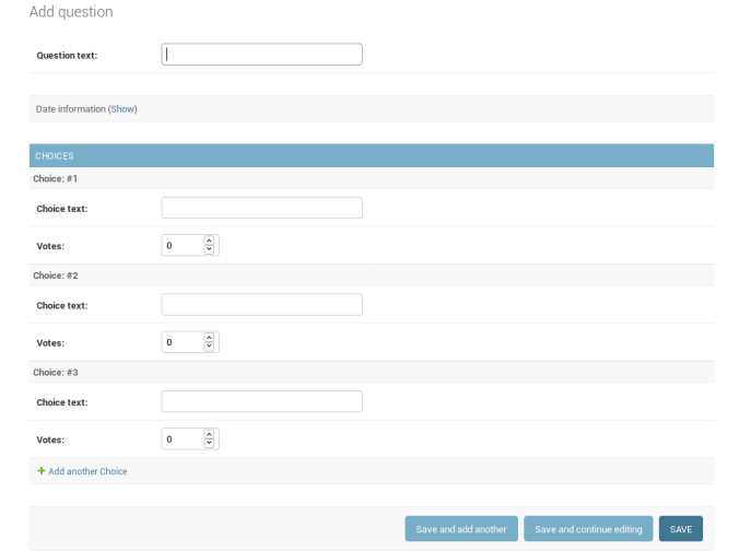 Việc nhúng các mục bình chọn được thực hiện bởi dòng inlines = [ChoiceInline]. Trong đó lớp ChoiceInline lấy mô hình là Choice; extra = 3 xác định mặc định 3 mục bình chọn trống được thêm trước trong trang soạn thảo câu hỏi. Bộ phận ngày xuất bản được thêm lớp collapse, có tác dụng trình bày trong trạng thái co lại để tiết kiệm không gian màn ảnh. Bạn sẽ thấy rõ hơn khi mở trang “Add question”: