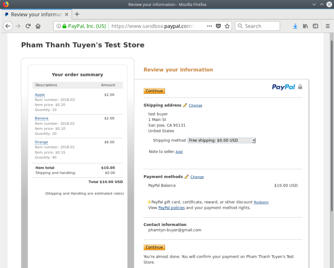 Nhấn vào “Continue” để thanh toán, bạn sẽ được quay trở lại cửa hàng với bản chi tiết thanh toán