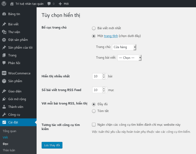 WooCommerce là một plugin dùng để thiết lập một cửa hàng trực tuyến. Giống như đặc điểm chung của các ứng dụng mà cần một loại post riêng biệt, WooCommerce định nghĩa hộp meta cho post sản phẩm. Chúng ta biết rằng theme điều khiển trình bày nội dung trên trang, vì vậy tốt nhất là bạn sử dụng WooCommerce kết hợp với Storefront – một theme đi cặp với WooCommerce. Để site ra dáng một cửa hàng, bạn vào menu quản trị, ấn Cài đặt > Đọc, rồi chọn trang đầu là “Một trang tĩnh” thay vì “Bài viết mới nhất”. Trong mục “Trang chủ”, chọn trang “Cửa hàng”: