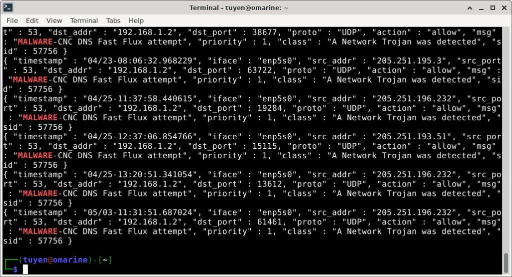 sudo firewall-cmd –zone=public –add-rich-rule=’rule family=”ipv4″ priority=-32768 source address=”205.251.0.0/16″ port port=”53″ protocol=”udp” log prefix=”MALWARE: ” reject’ –-permanent