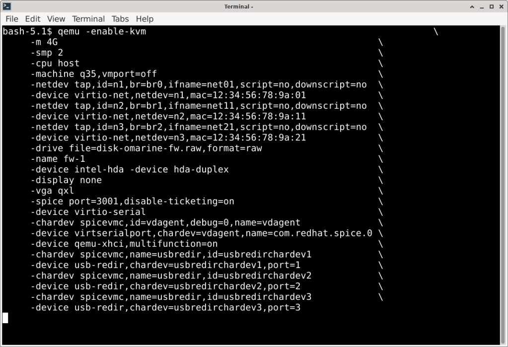 • -drive file=disk-omarine-fw.raw,format=raw: The virtual machine uses the disk image disk-omarine-fw.raw, raw format