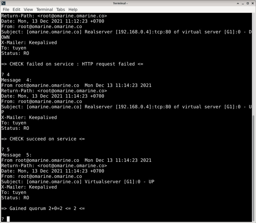 Notifications about the virtual service and the health of real servers are emailed to tuyen@omarine.omarine.co