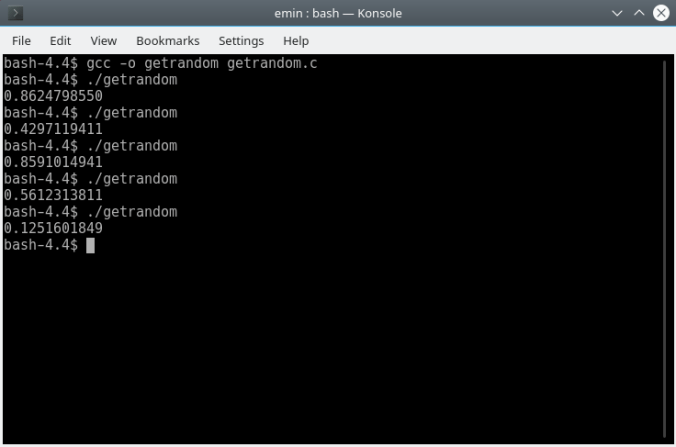 The better solution is to use the getrandom() function provided by Linux 3.17 and later. The following small program uses getrandom() to provide seed for the erand48() function. The erand48() function return nonnegative double-precision floating-point values uniformly distributed over the interval [0.0, 1.0):