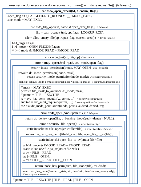 When called, do_open_execat() calls do_filp_open() (defined in fs/namei.c), with the flag argument is an open_flags structure. The open_flags structure is initialized with its component open_flag = O_LARGEFILE | O_RDONLY | __FMODE_EXEC, and access mode component acc_mode = MAY_EXEC.