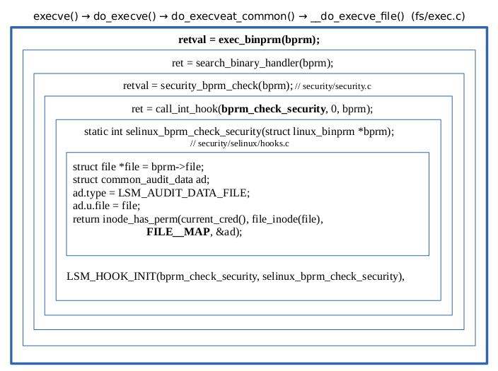 The checking for setexec permission is in the selinux_setprocattr() hook function. However, that is done outside execve() and details about it are beyond the scope of this article.
