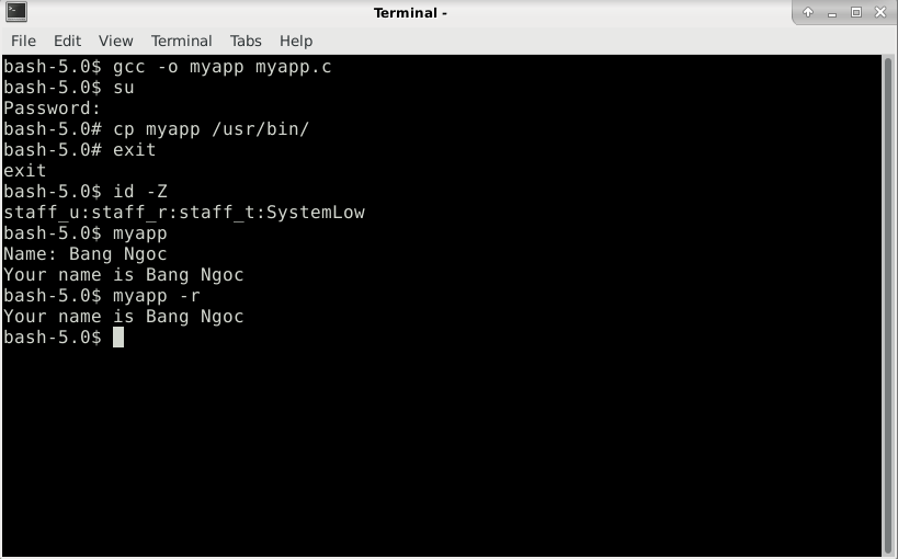 The result is the myapp binary. Now we copy myapp to /usr/bin. The binary /usr/bin/myapp will be of type myapp_exec_t. See myapp.fc.