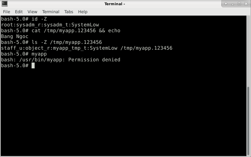 Clearly myapp_t domain has access to program data. But no user can directly access the data except root. That means the user staff_u with the staff_t domain cannot read directly /tmp/myapp.123456 which has the type myapp_tmp_t