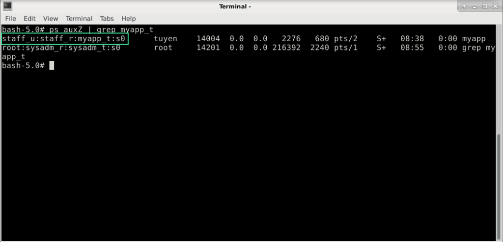 The program pauses waiting for input from the user. Now is the opportunity for us to see the process in the domain myapp_t. Since the process has transitioned to the myapp_t domain, only root can see it with the ps command in another command window: